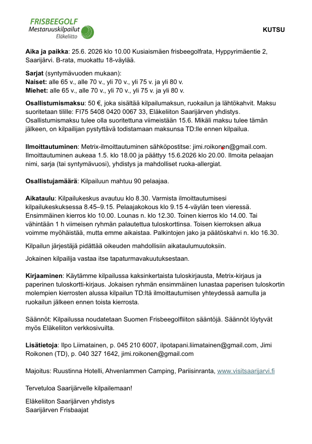 Eläkeliiton valtakunnalliset Frisbeegolfmestaruuskisat Keski-Suomessa Saarijärvellä