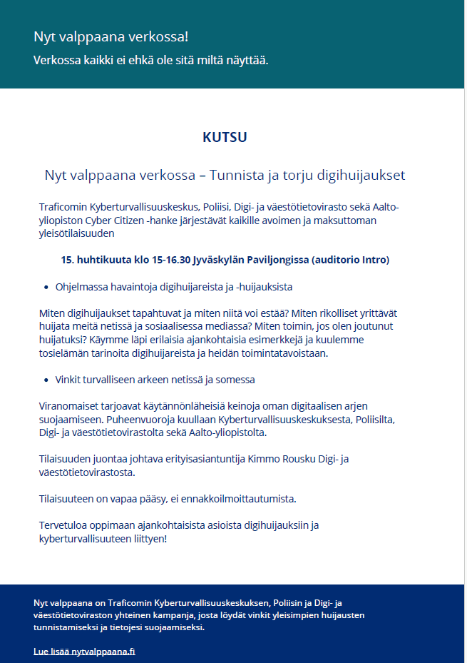 Nyt valppaana verkossa – tunnista ja torju digihuijaukset – tilaisuus Jyväskylän Paviljongissa