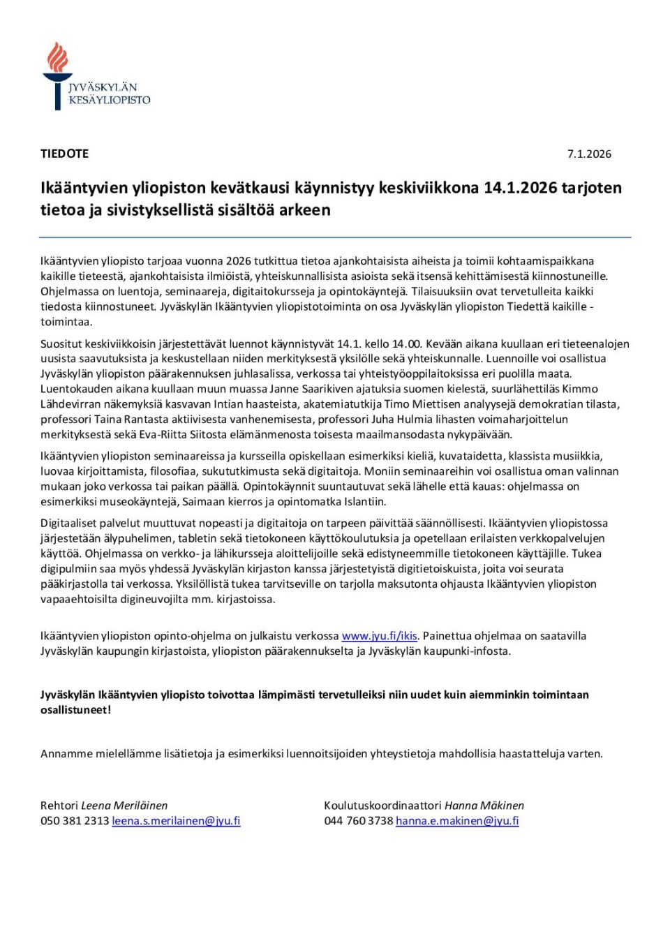 Ikääntyvien yliopiston tiedote kevät 2026